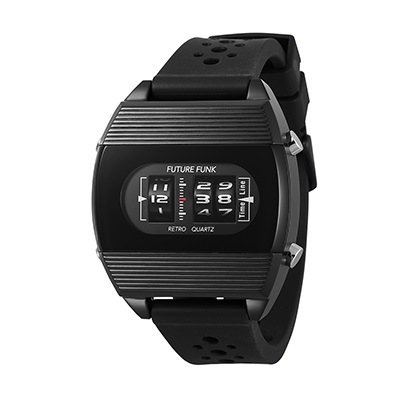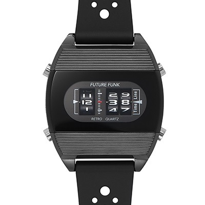 1970年代に流行したスペースエイジデザインで人気のローラーデジタルウォッチ『FUTURE FUNK』に当時のトレンドであった、ケースにガラスをはめ込んだトノーケースがラバーバンドで登場。