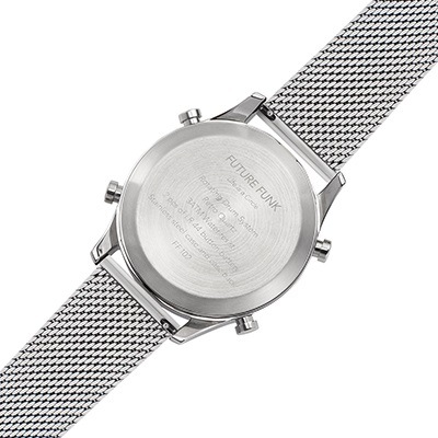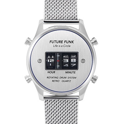 1970年代に流行したスペースエイジデザインで人気のローラーデジタルウォッチ『FUTURE FUNK』に待望のメタルバンドモデルが登場。ヘアライン仕様のメタルバンドで、ケースフロント部分とトーンを合わせたソリッドで高級感のある一本に仕上げました。