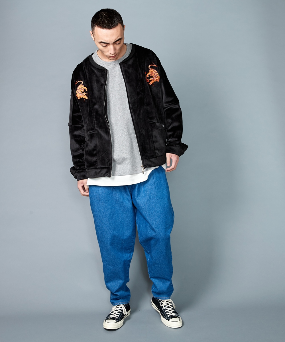 ウエストやもも周りにタックを入れ、ゆとりを持たせたボンバー仕様。