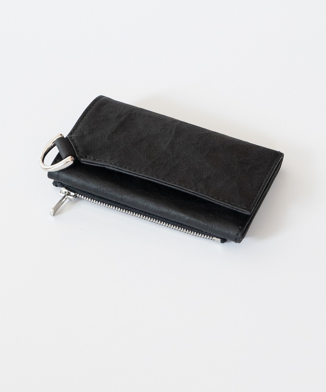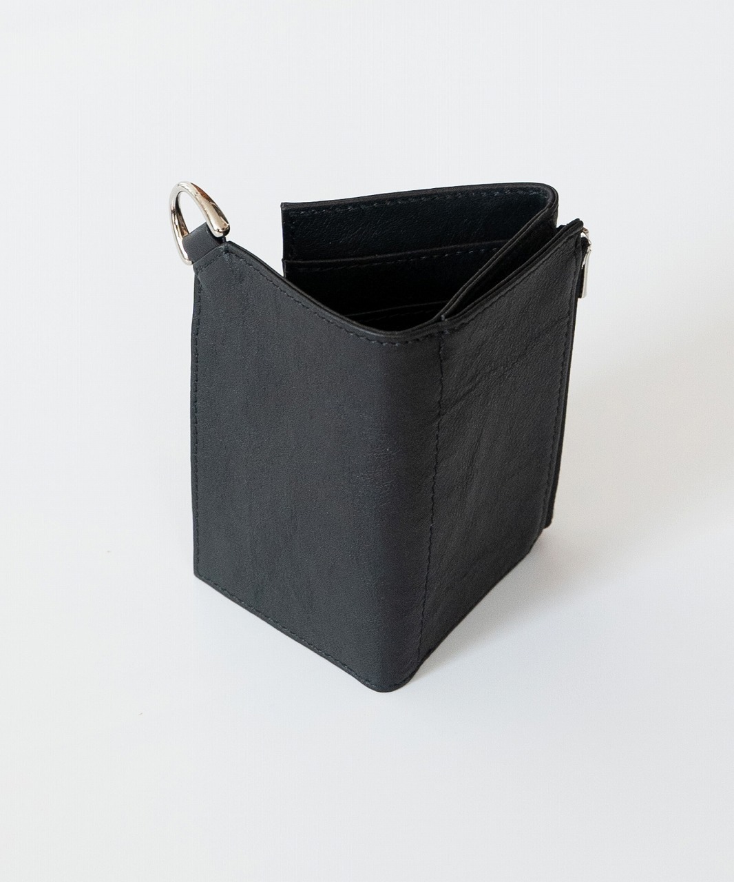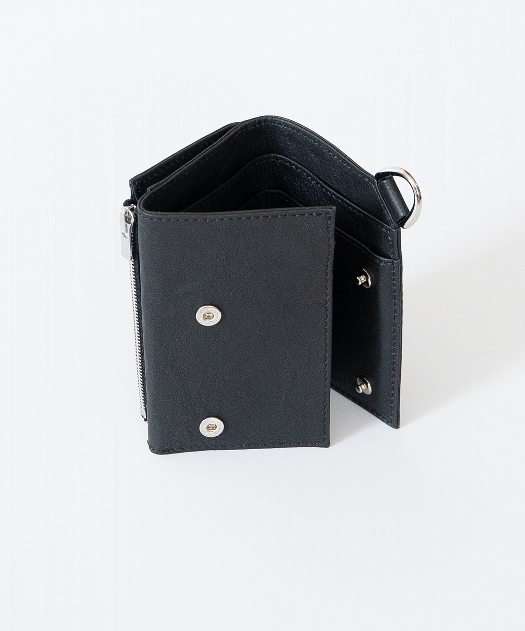 内側にカードポケット、札入れ、折りたたんだ外側には コイン用のジップポケットを配しています。