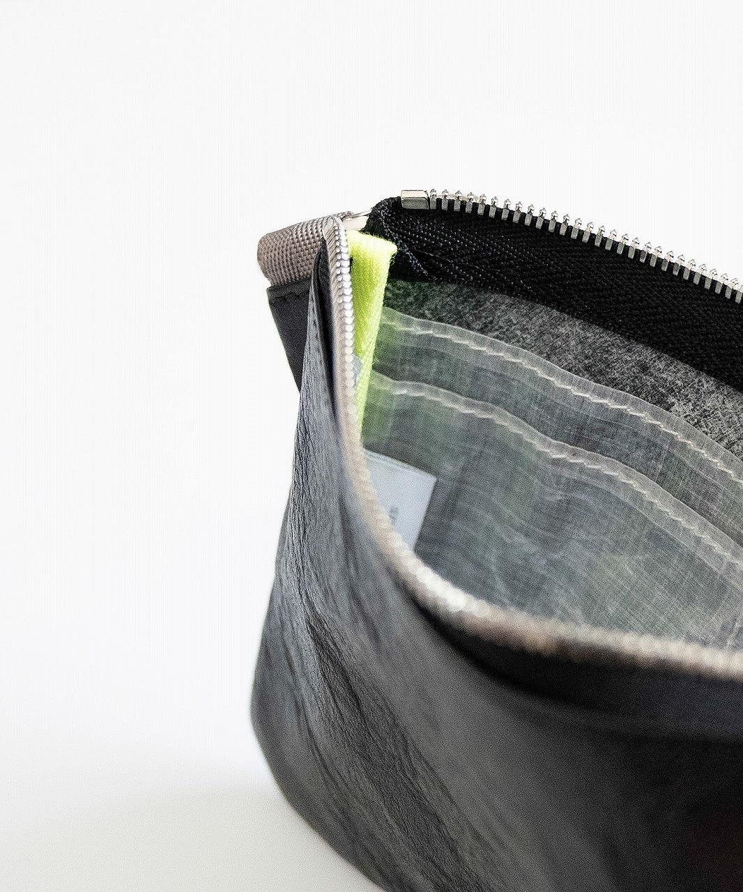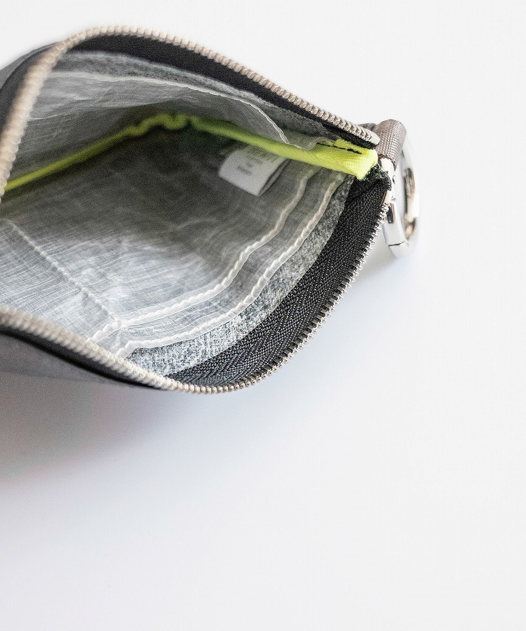 ダイニーマレザーを使用したポーチ。 左右両面の内側の仕切りポケットにはダイニーマのラミネート ファブリックを使用、半透明な白の素材に映える蛍光カラーの パイピングテープをあしらうことで表の落ち着いたイメージとは 異なりポップな仕上がりにしています。