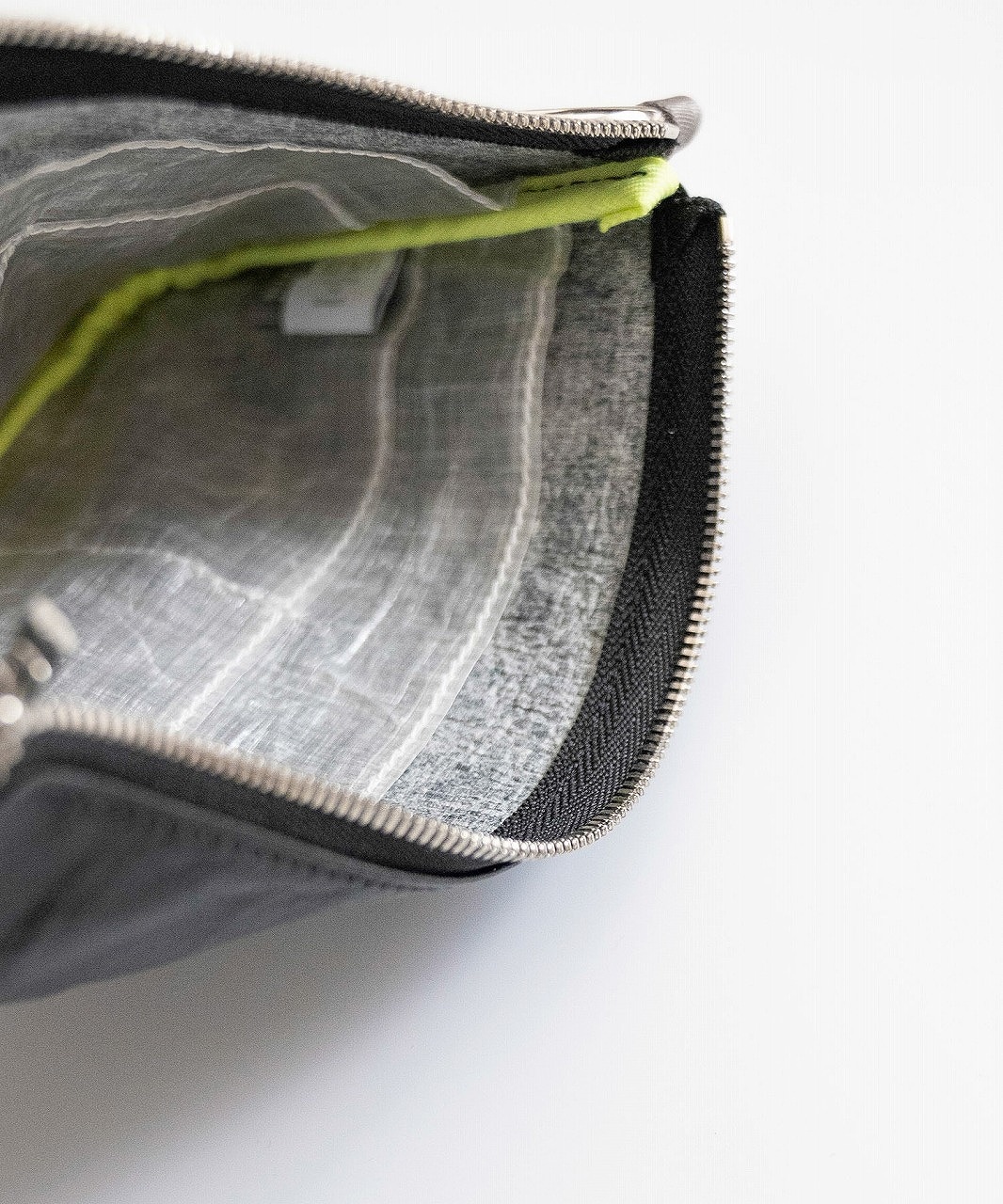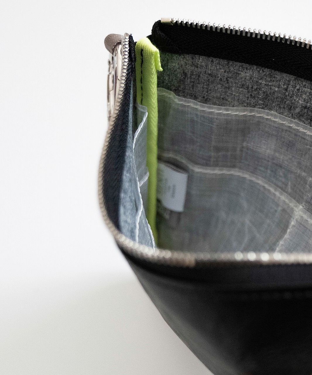 ダイニーマレザーを使用したポーチ。 左右両面の内側の仕切りポケットにはダイニーマのラミネート ファブリックを使用、半透明な白の素材に映える蛍光カラーの パイピングテープをあしらうことで表の落ち着いたイメージとは 異なりポップな仕上がりにしています。