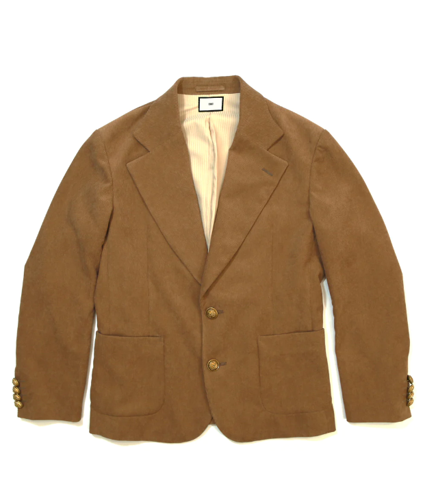 シワになりにくいコーデュロイ生地を使用し、雰囲気を格上げする金ボタンが特徴。