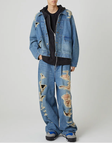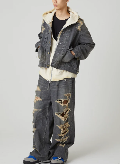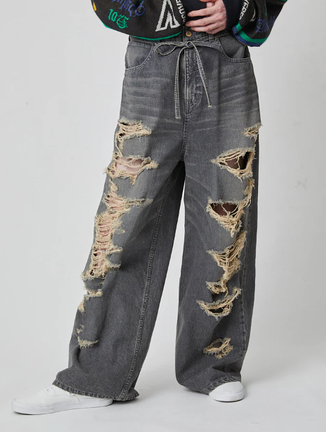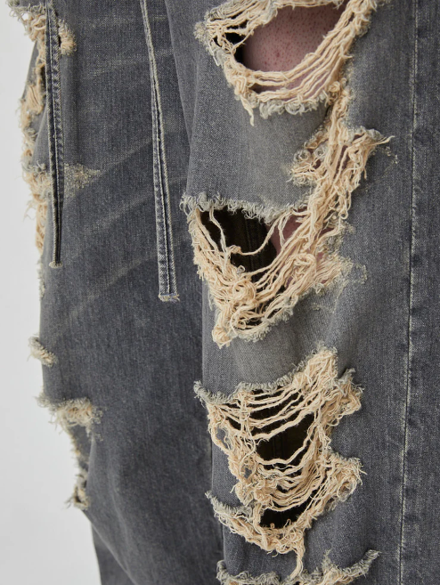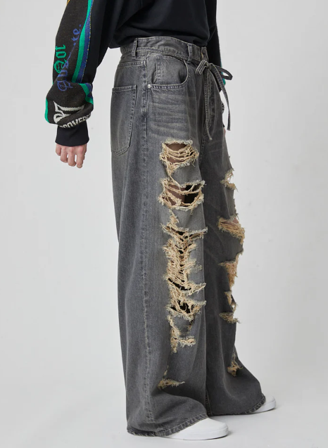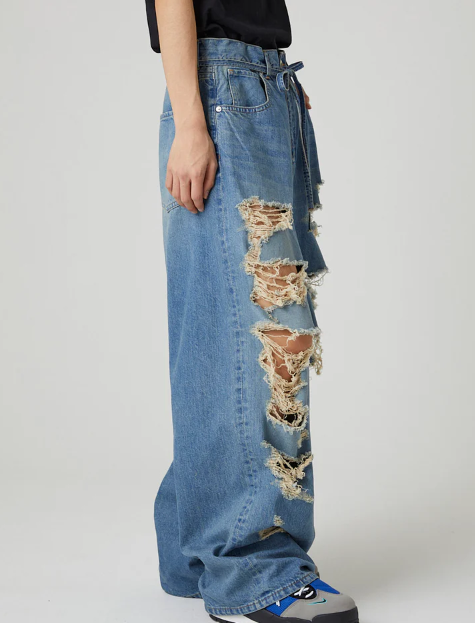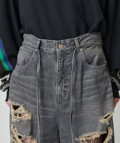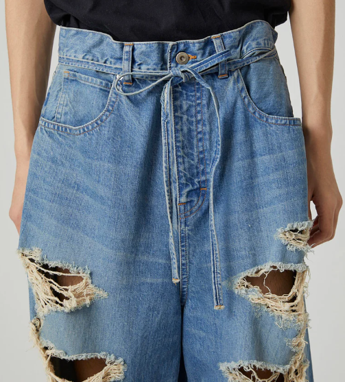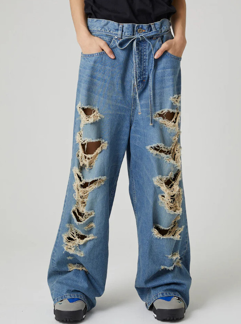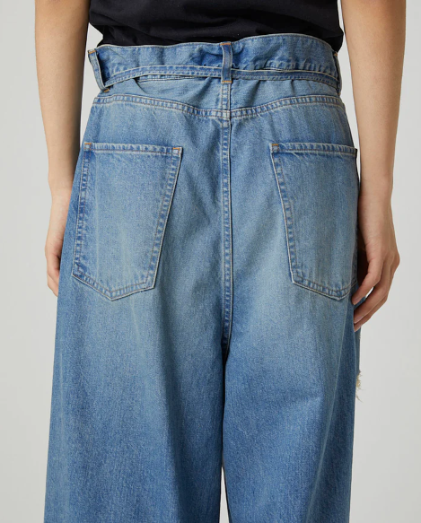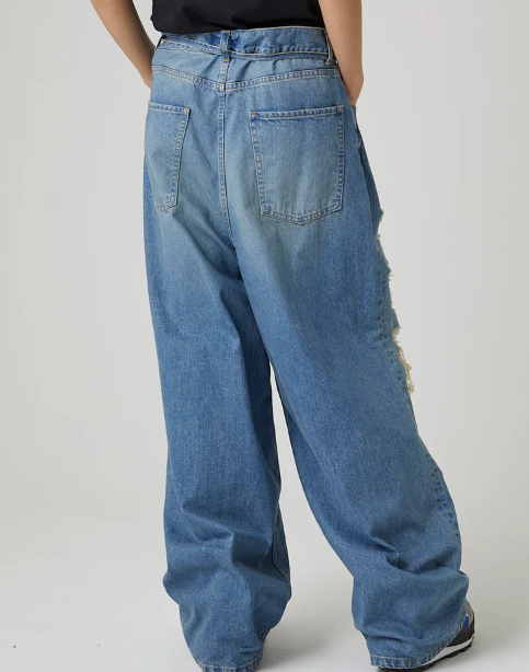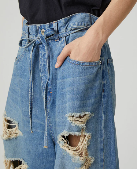加工にはブリーチ、擦り、横糸残し穴あけ、オーバーダイ、シルエットはワイドバギーシルエットと今の気分にピッタリの取り入れやすいアイテム。