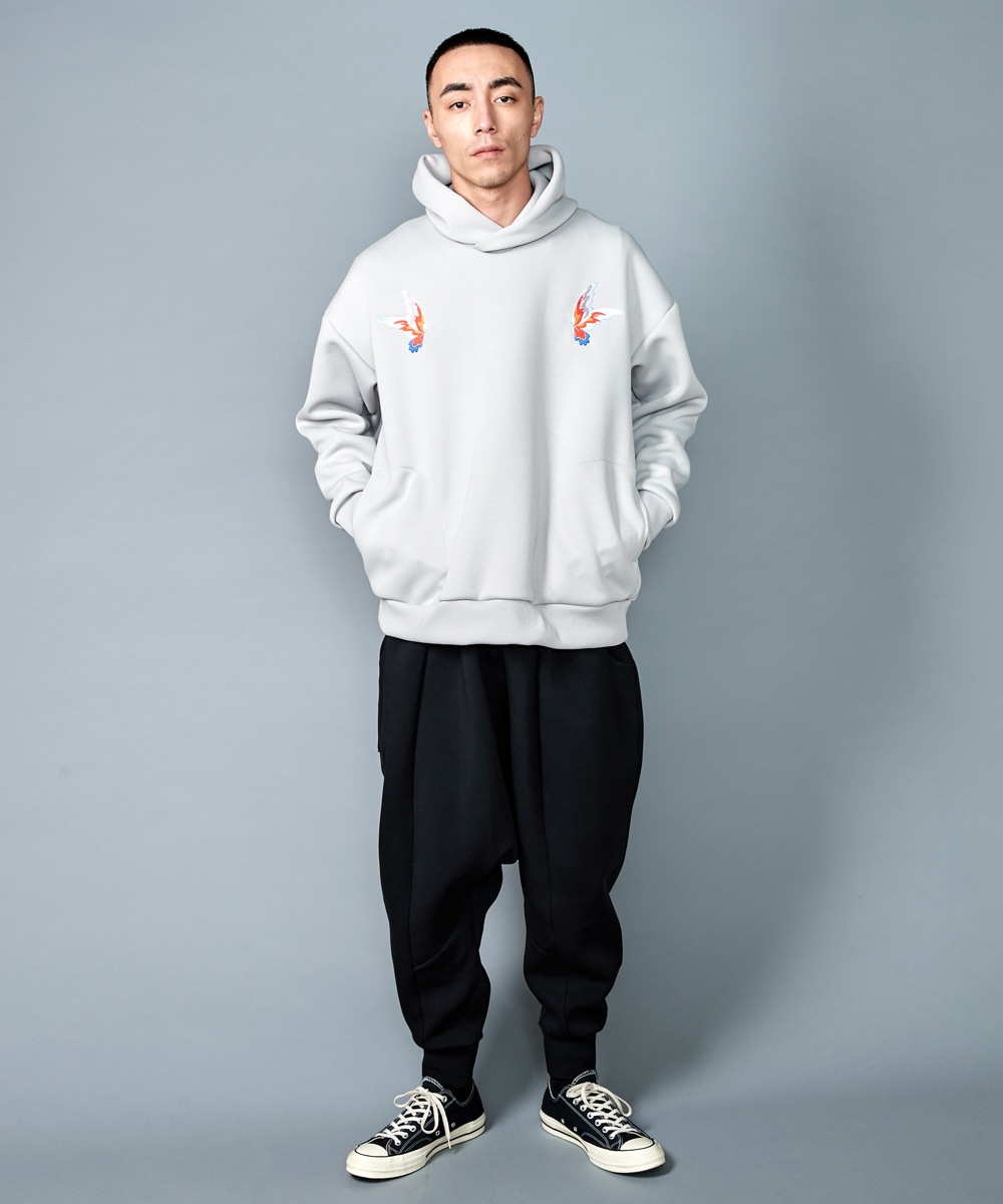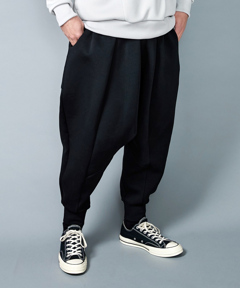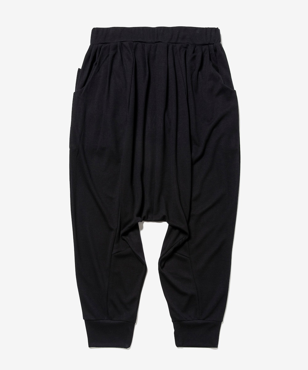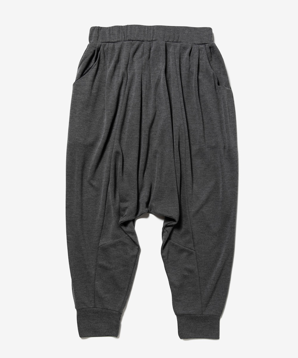 高い速乾性、通気性を持つ機能素材でスポーティーに仕上げながら、深く取ったタックや上品な裾の折り返し処理など、民族衣装であるサルエルパンツをrehacerらしいスッキリとしたシルエットに仕上げました。