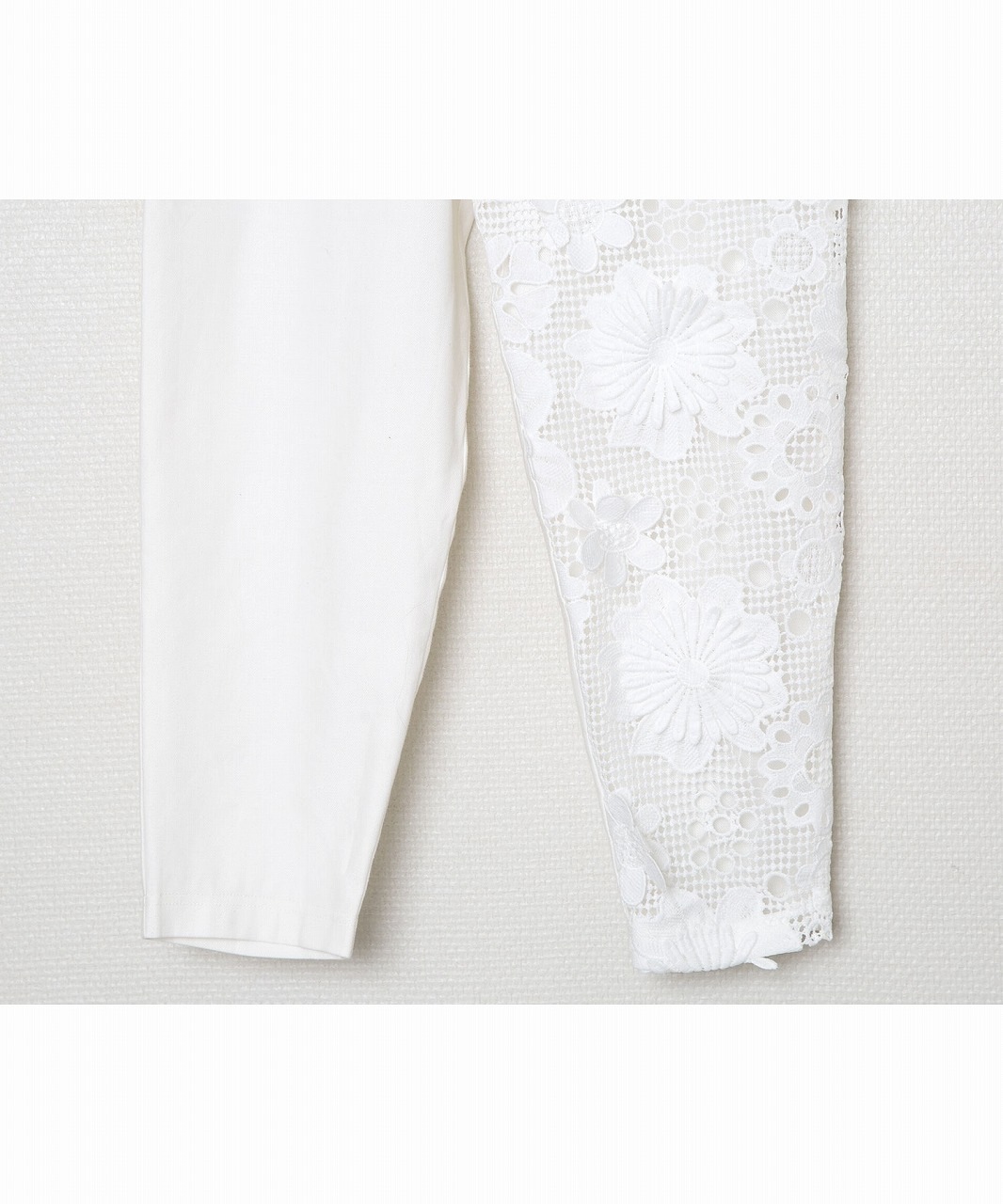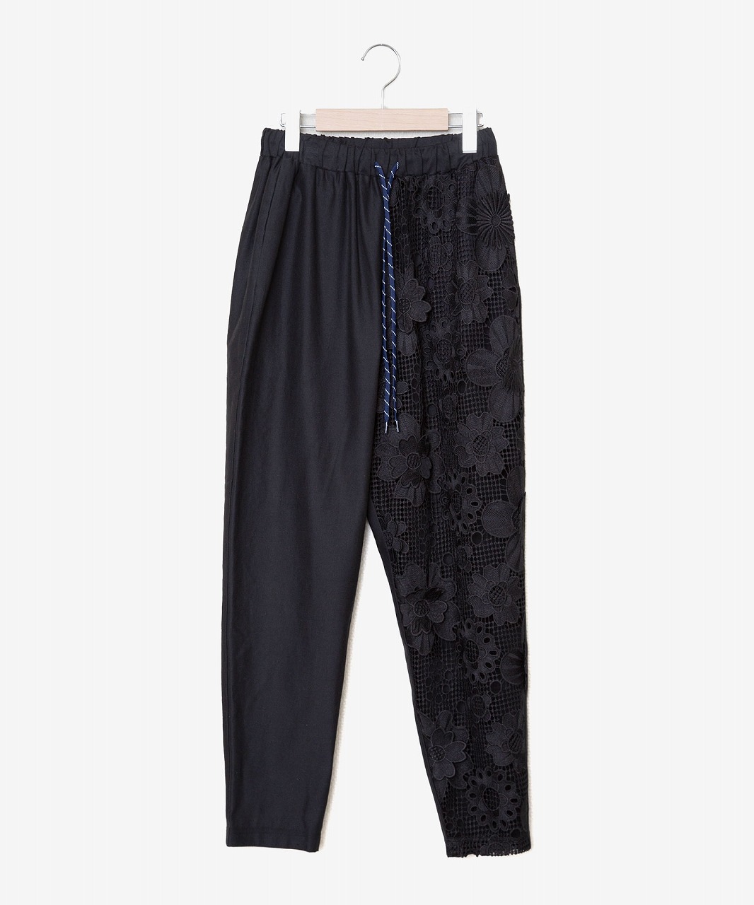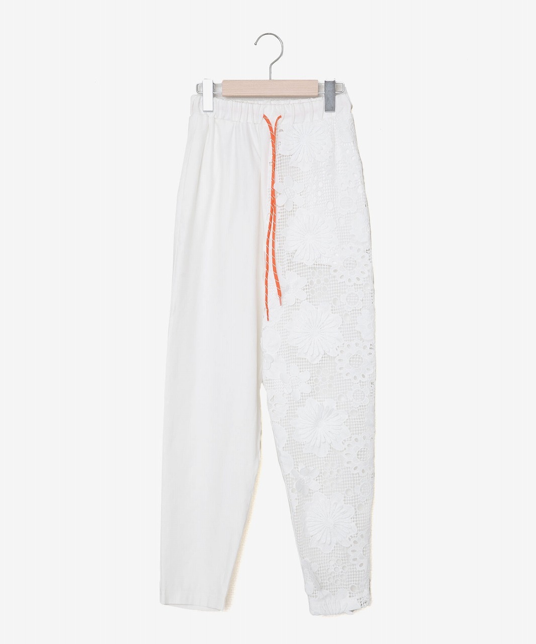 麻混の涼しげな素材と立体的に編まれたレース素材を組み合わせたシルエットの美しいイージーパンツ。