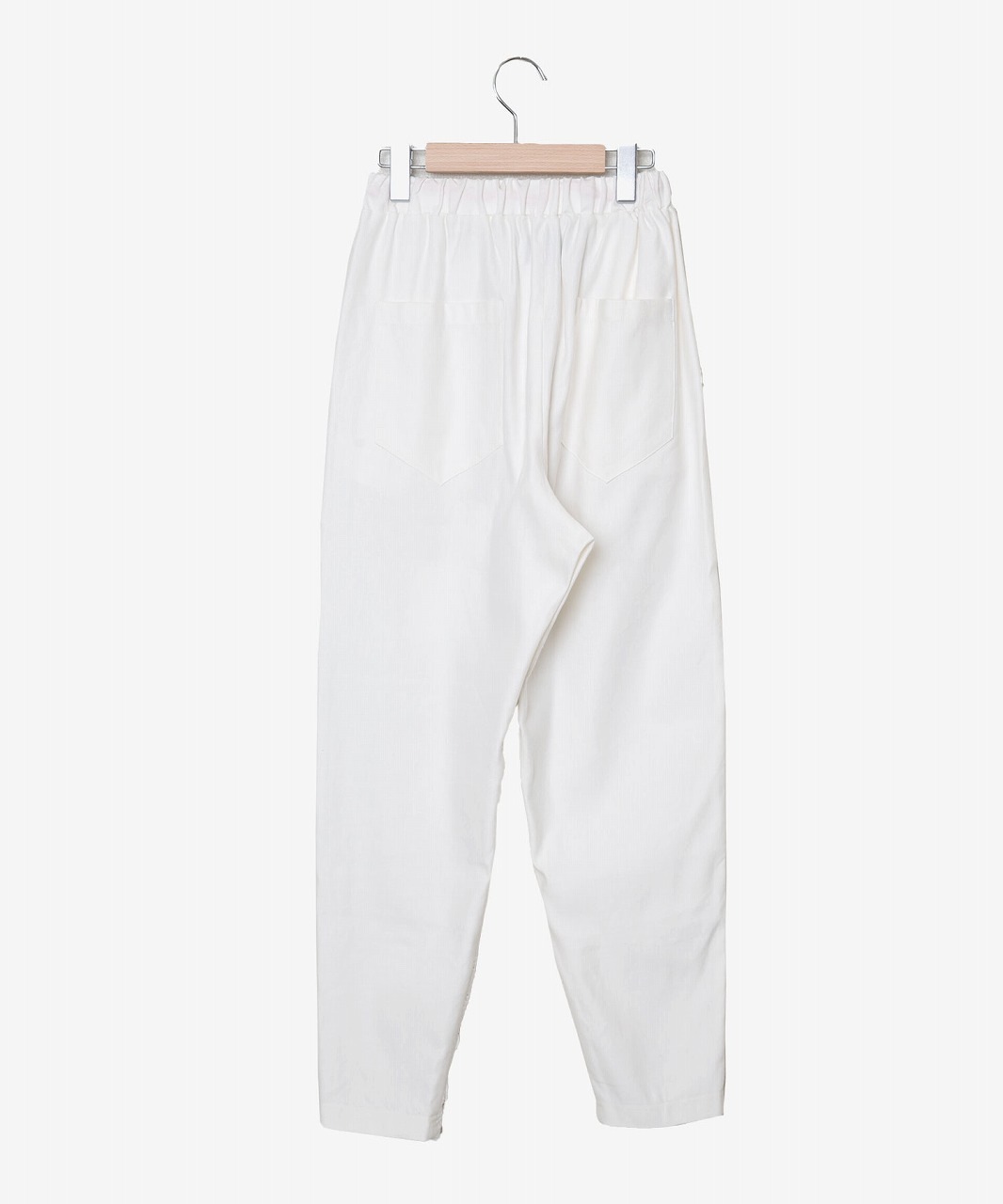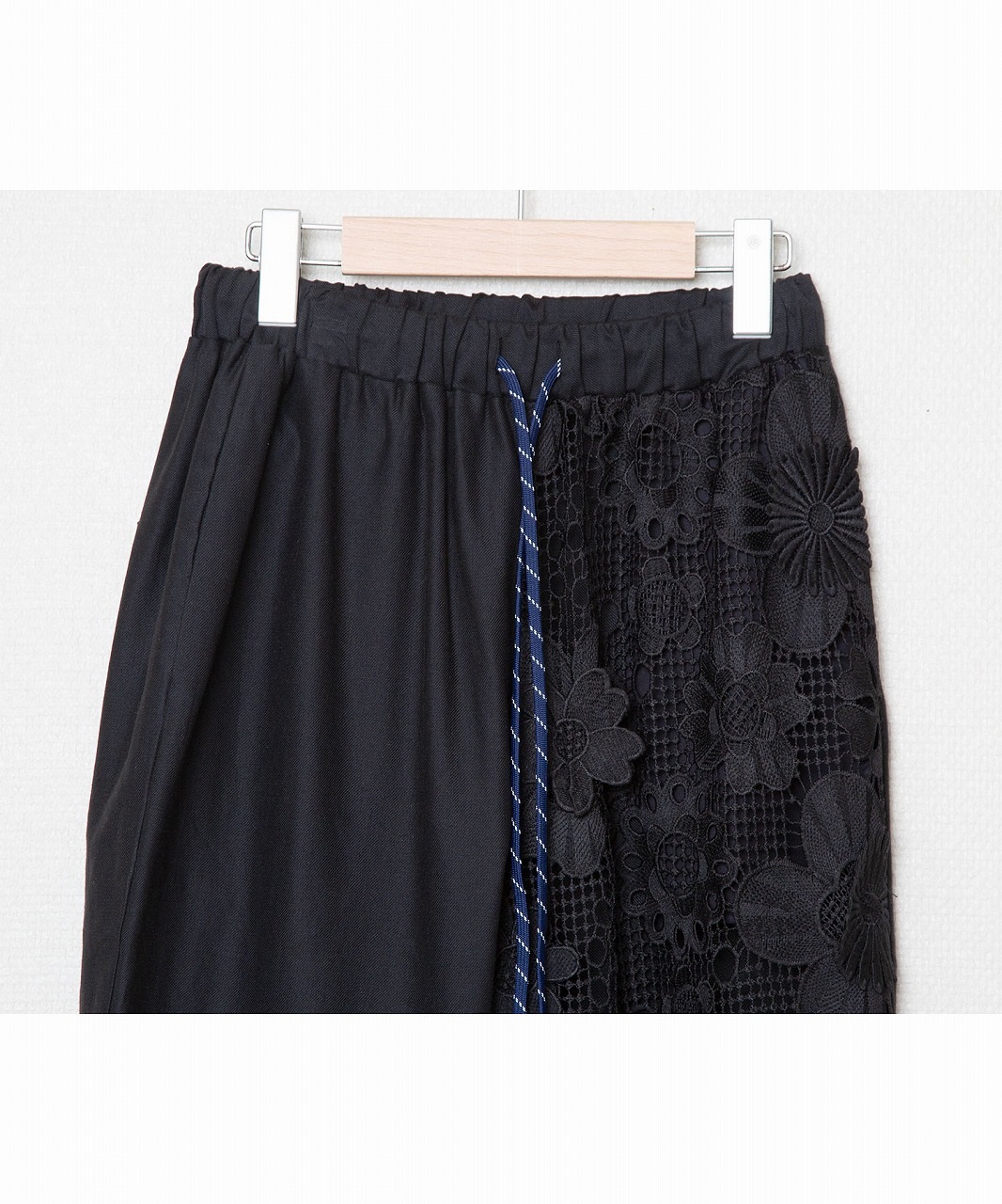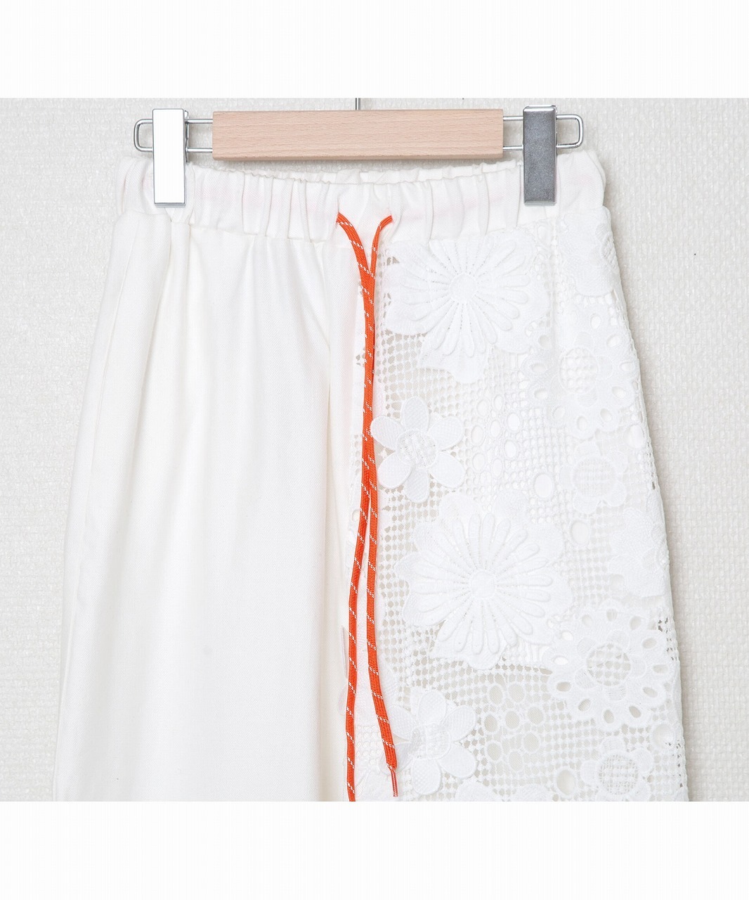 麻混の涼しげな素材と立体的に編まれたレース素材を組み合わせたシルエットの美しいイージーパンツ。