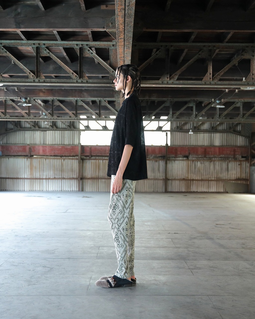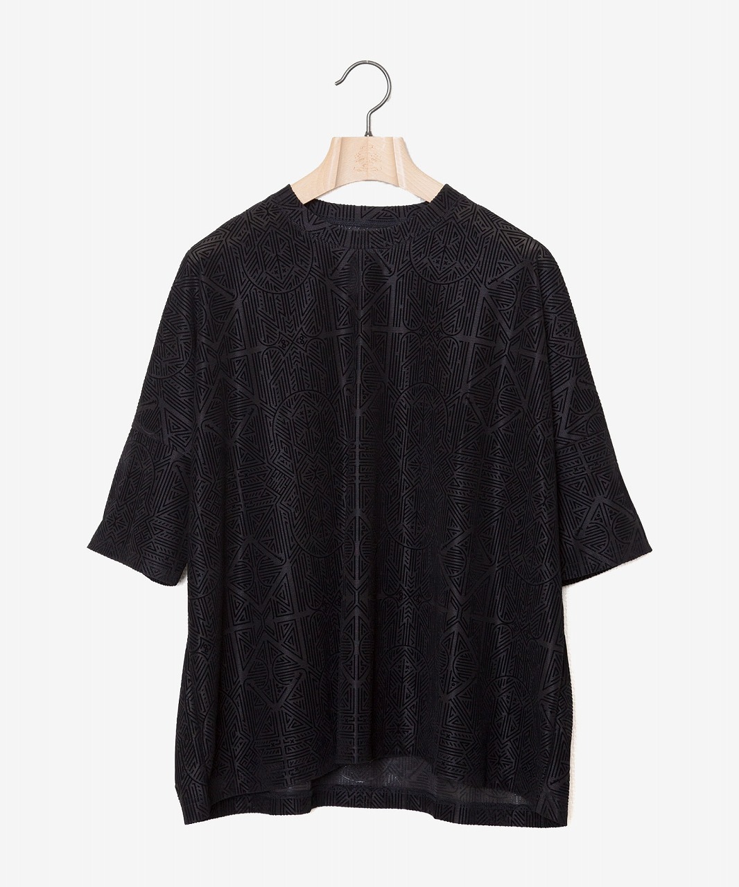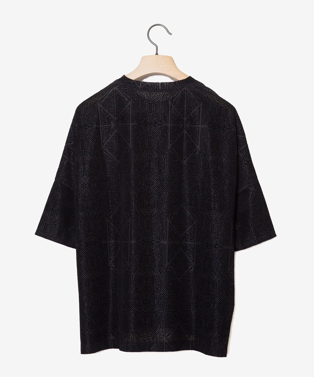 透け感のある天竺素材に同色でさりげなくプリントされた曼荼羅と枯山水をモチーフにしたフロッキープリントが特徴的なオーバーサイズTシャツ。