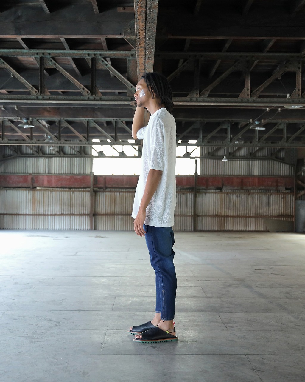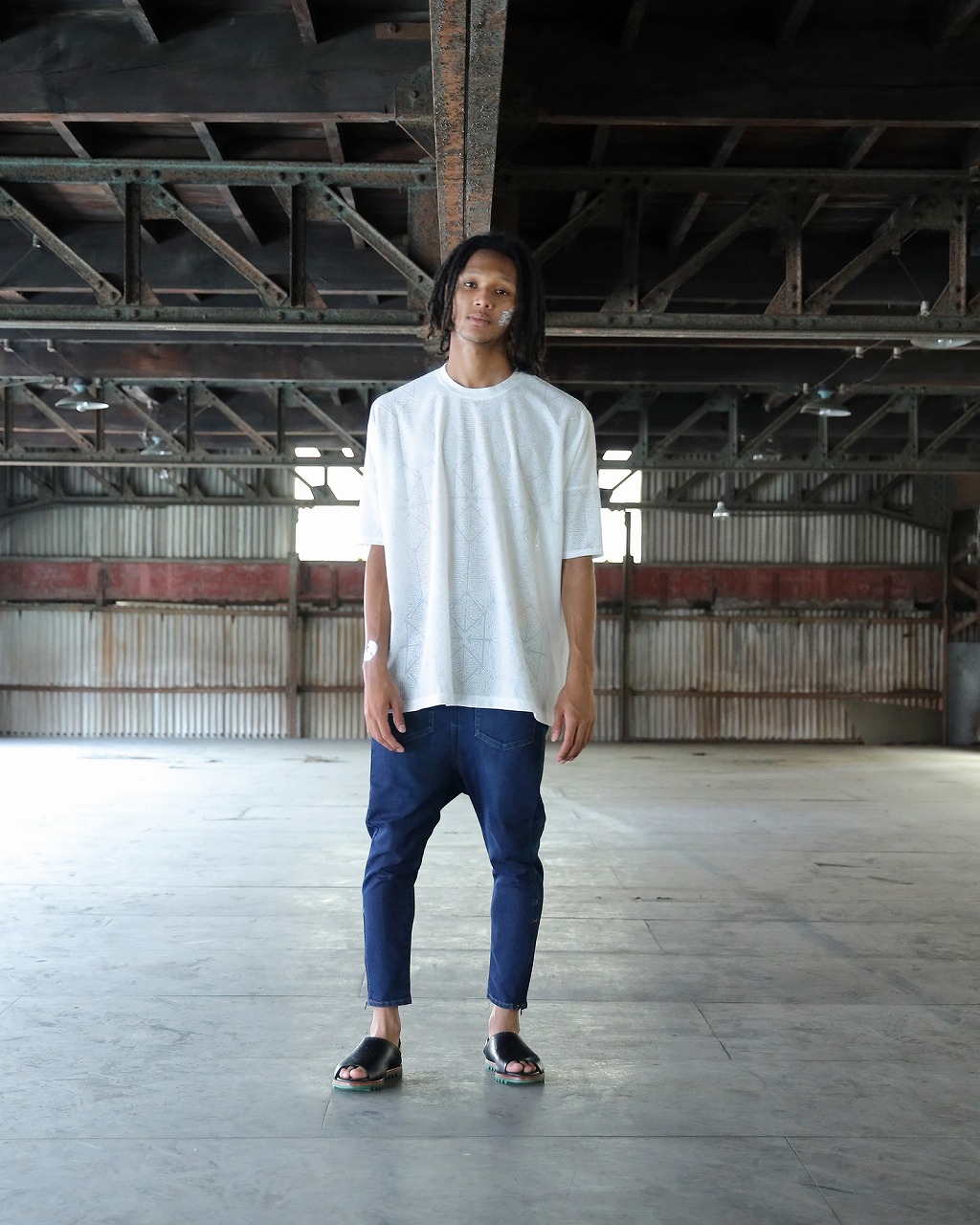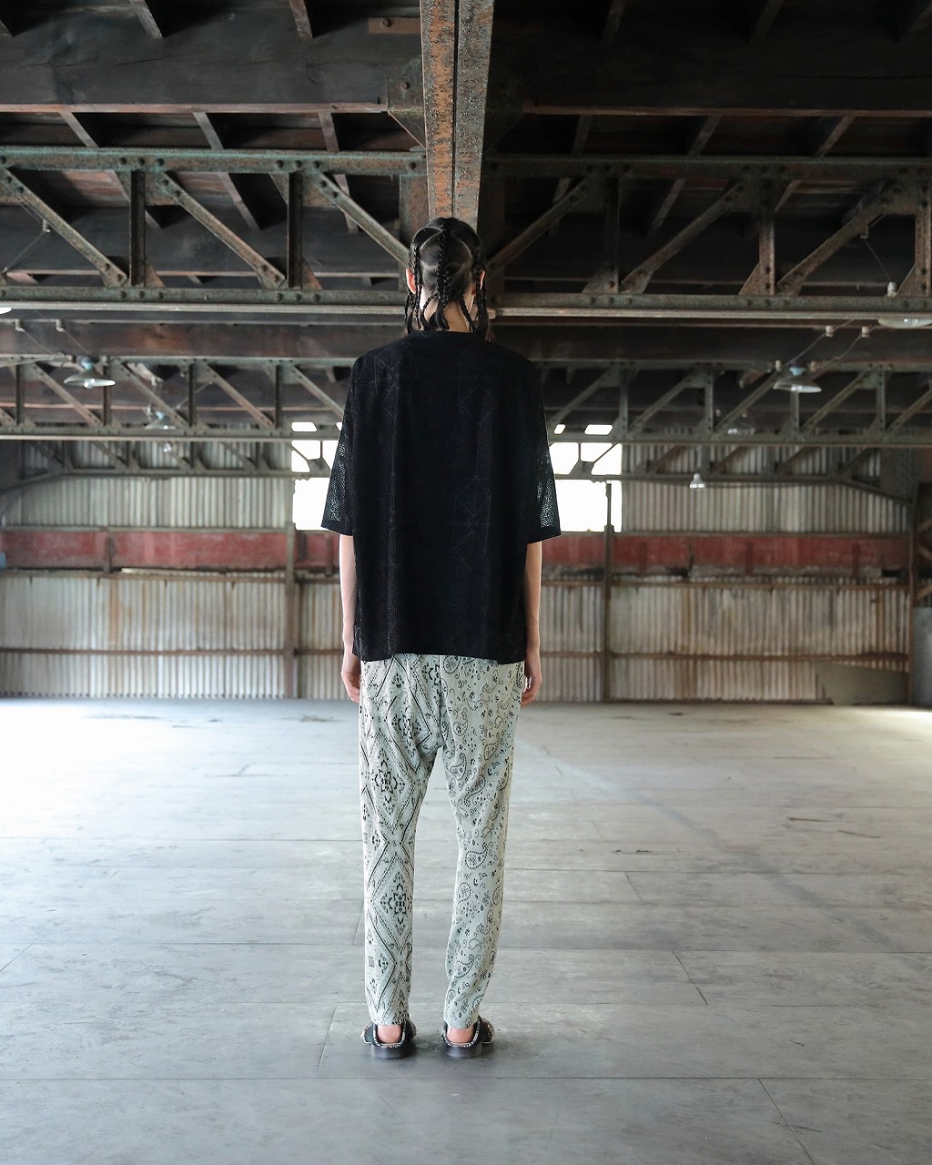 透け感のある天竺素材に同色でさりげなくプリントされた曼荼羅と枯山水をモチーフにしたフロッキープリントが特徴的なオーバーサイズTシャツ。