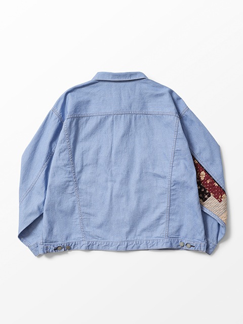 ■袖裏切り替えのデニムジャケット。8オンスの軽く柔らかな風合いのデニム生地を使用した、3rdタイプのデニムジャケット。製品後にバイオウォッシュを施すことで、ステッチにアタリの出た独特な質感に仕上げられています。右袖裏には、約100年前に手作業で作られたキルトの古布を使用した切り替えをデザイン。アウターとしてはもちろん、インナーとしてもシャツ感覚で着ることができる軽快なジャケットとなっています。※古布は手作業で製作されているため、一点一点柄が異なります。お選びいただくことはできませんので予めご了承ください。