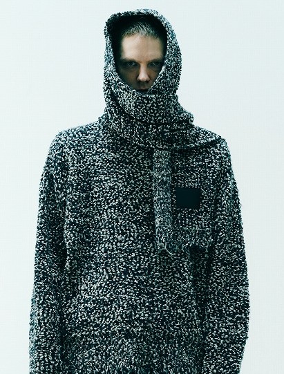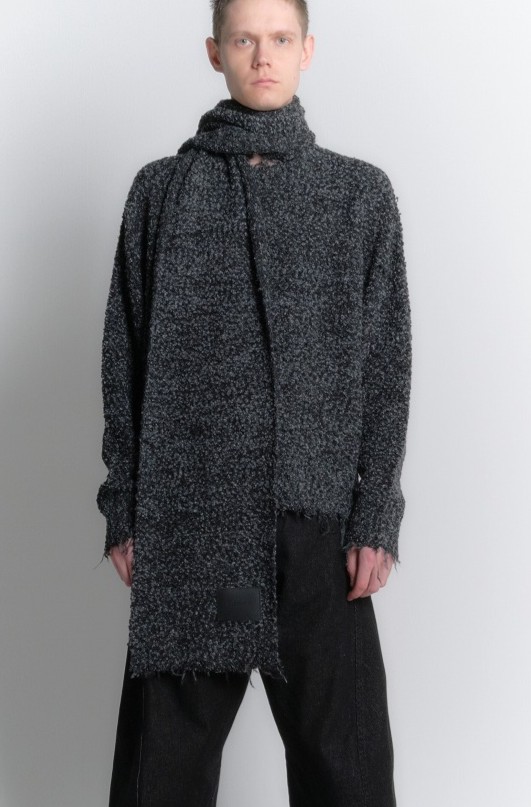 特徴的な丸みのあるブークレ糸を2本引き揃えて編み上げた柔らか なマフラー。ダメージ風のフリンジとレザーパッチがアクセント となり、カジュアルさと高級感を兼ね備えたデザインが特徴。