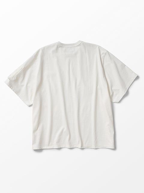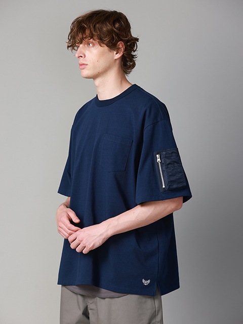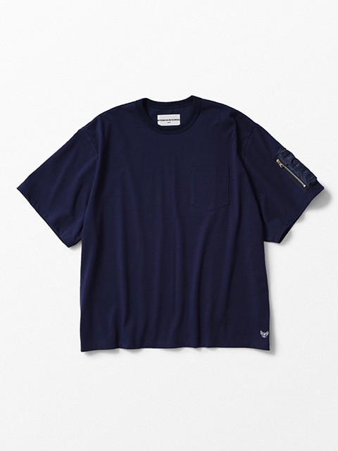 ■袖ポケット付きのTシャツ。左袖にフライトジャケット風のポケットを配置。ナイロン素材とシルバージップが映えるデザインとなっています。ハリ感のあるヘビーウェイトの生地を使用したBIGシルエットの一枚。左裾にアイコン刺繍が入っています。