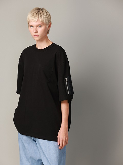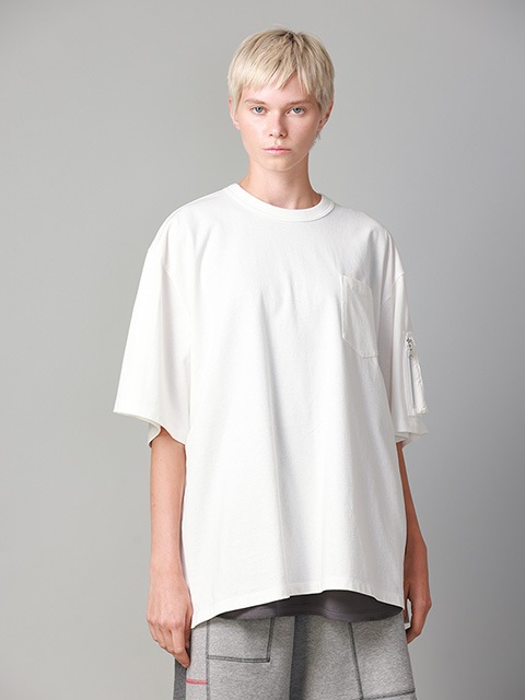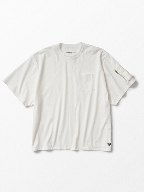 ■袖ポケット付きのTシャツ。左袖にフライトジャケット風のポケットを配置。ナイロン素材とシルバージップが映えるデザインとなっています。ハリ感のあるヘビーウェイトの生地を使用したBIGシルエットの一枚。左裾にアイコン刺繍が入っています。