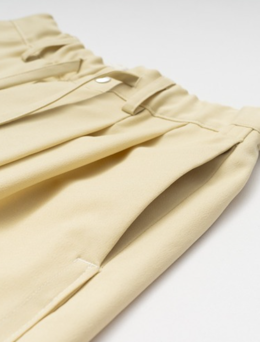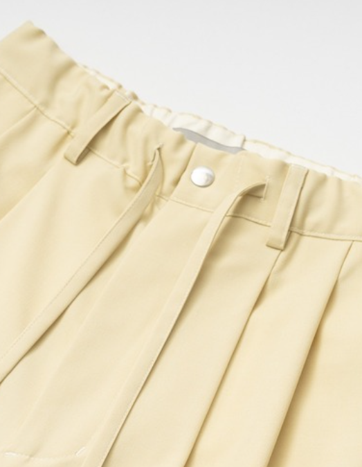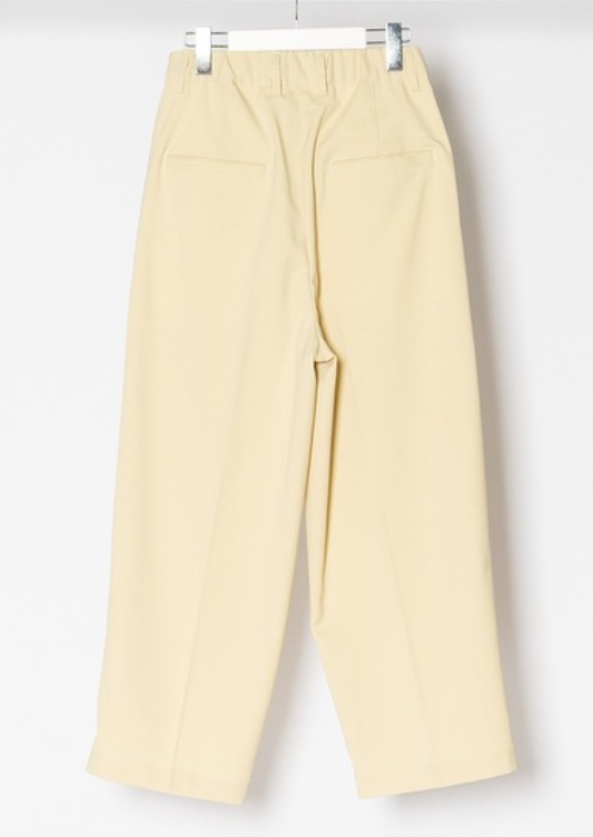 ウェストはスピンドルとゴムの入ったウェストベルトの為、快適な着用が可能です。上質なポリエステルギャバを使用している為、イージーケアだけではなく素材の程良いハリがワイドなシルエットもキープしてくれます。
