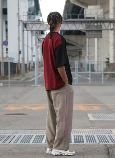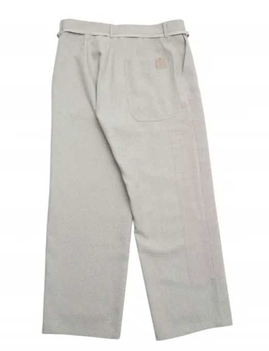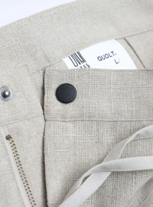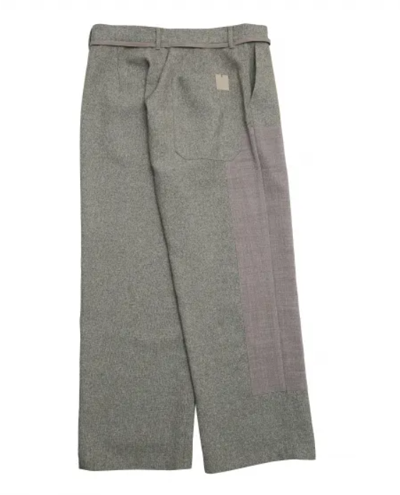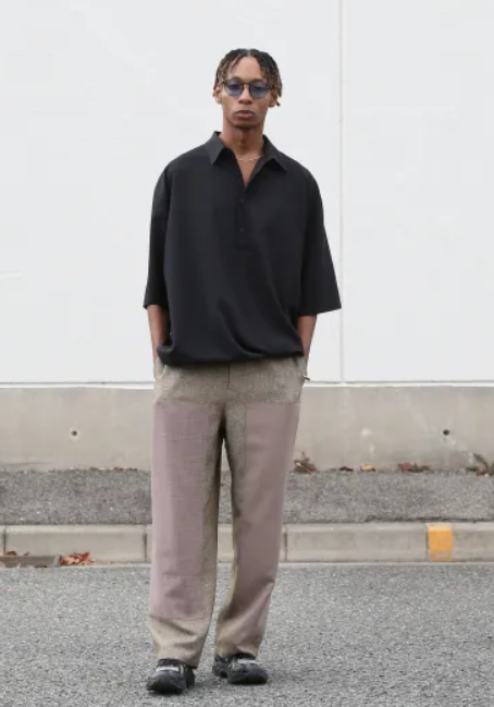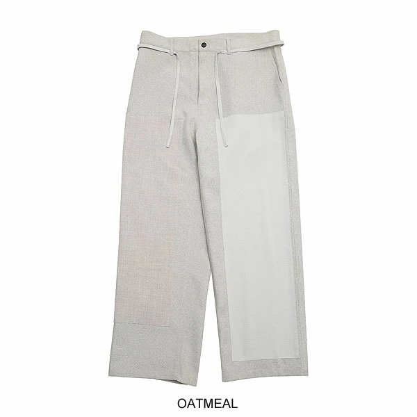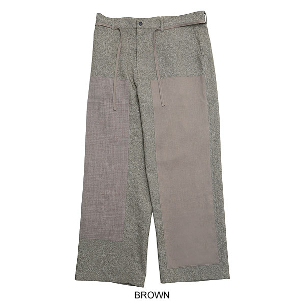 3 種類の麻調生地を組み合わせた風合いのあるパンツ。メランジ調で太さの異なる糸を織り込んだ凹凸のある素材に左右異なるパッチワークを施した手の込んだ逸品。