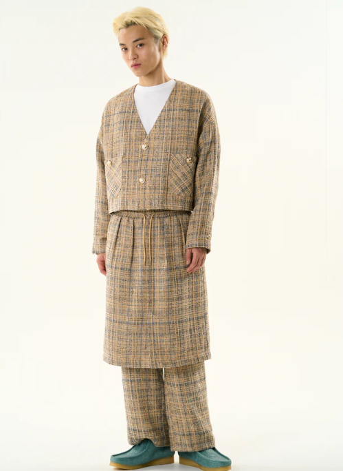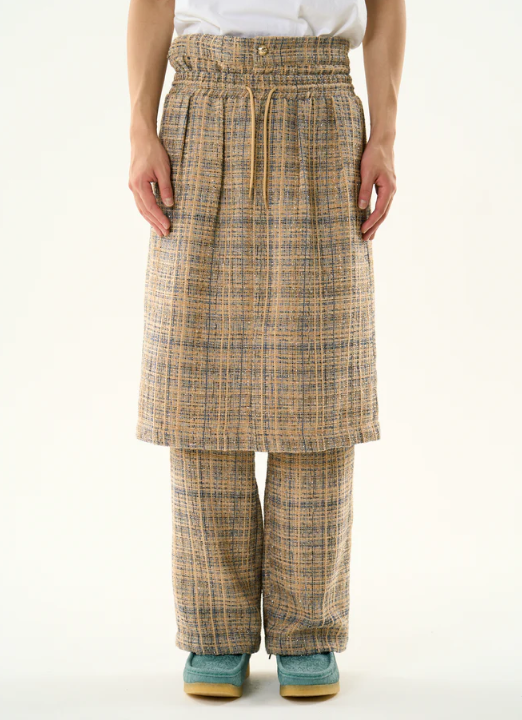 ツイードの素材感とスカートを重ねたようなレイヤードデザインがインパクト抜群なアイテム。