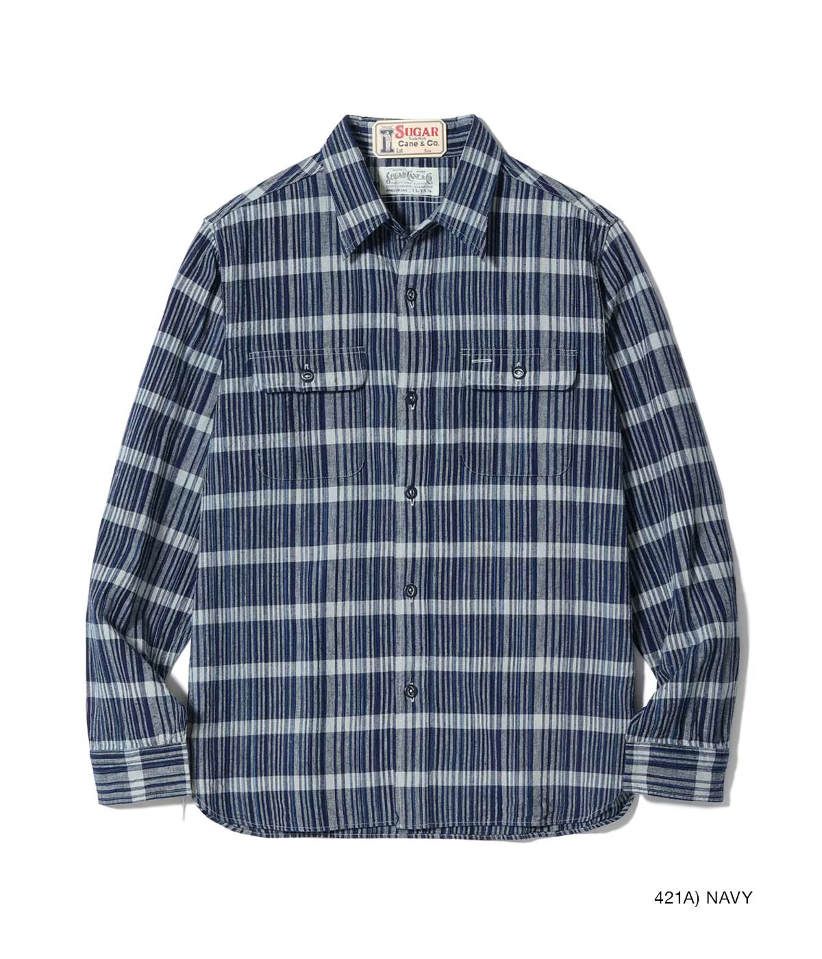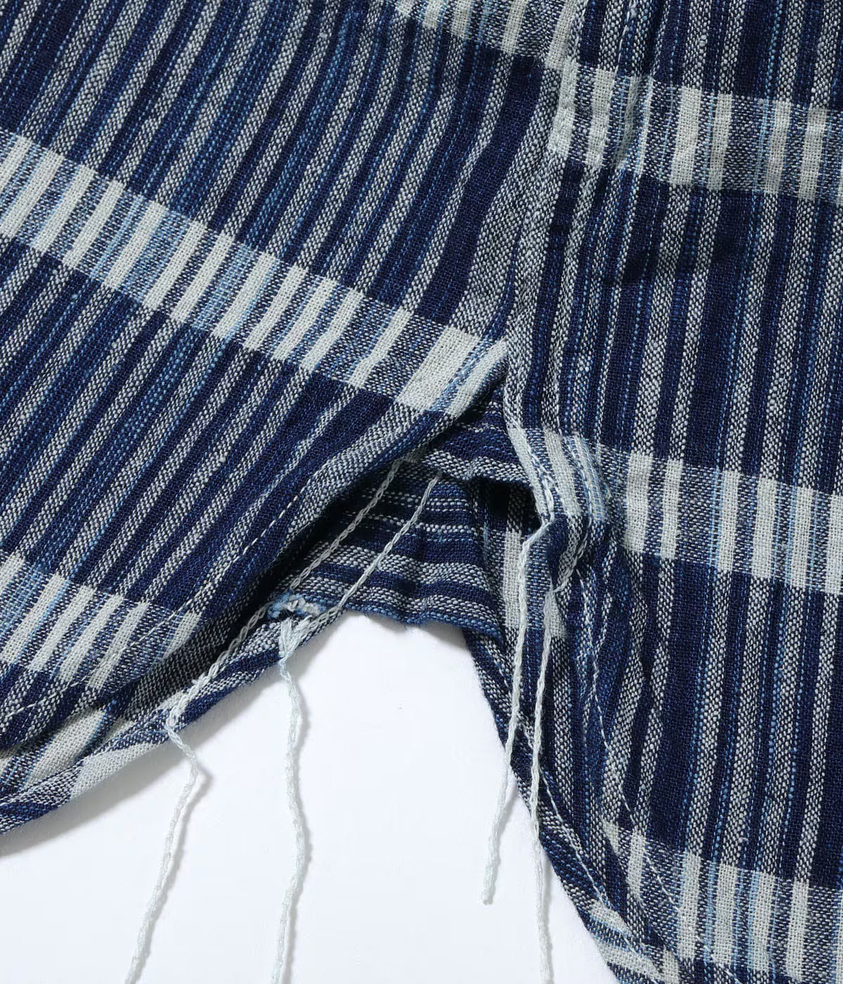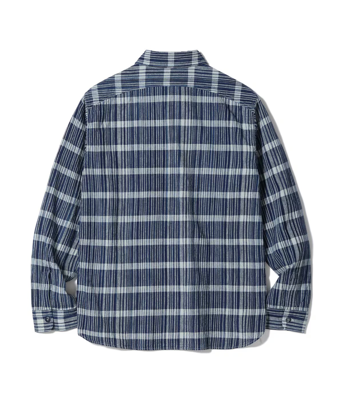 和装用の藍染古布をサンプリングして糸の質や柄はそのままに、経糸はインディゴの絣を含んだ3色、緯糸は1色で製作した長方形の格子柄。型は1940~50年代のダブルフラップポケットのアメリカンワークシャツに落とし込んでいる。胸のフラップとポケットは、ワークシャツには珍しく柄合わせを行なって取り付けられる。